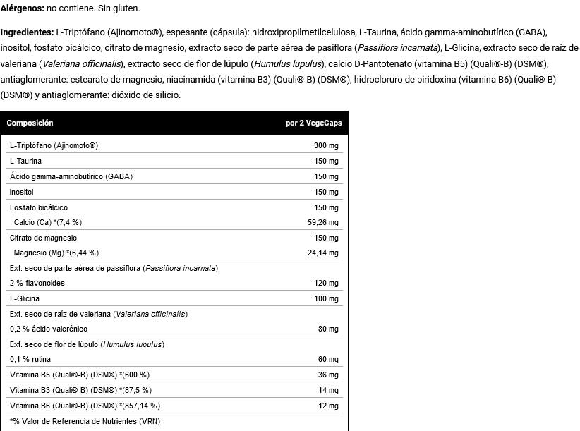 - GABA, L-Triptófano, L-Taurina y L-Glicina: Los estímulos que causan el miedo y la ansiedad disminuyen los niveles de GABA, lo que hace aumentar la síntesis de noradrenalina y predispone al organismo a un estado de alerta constante3. El L-Triptófano es necesario para la síntesis de serotonina (mediador muy importante en la regulación de la fase III y IV del sueño). El balance de adrenalina-serotonina regula el ritmo sueño-vigilia, y un desequilibrio en este balance está asociado con estados depresivos. La L-Taurina es un neurotransmisor que actúa de forma análoga al GABA. La L-Glicina actúa como inhibidor del SNC4 a nivel de la médula espinal, tallo cerebral y retina.