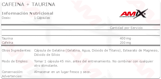 Cafeína + Taurina de AMIX NUTRITION es un suplemento a base de 200 mg de Caffeine Anhydrous y 400 mg de Taurina en formula pura. La cafeína es un estimulante que disminuye la sensación de cansancio.