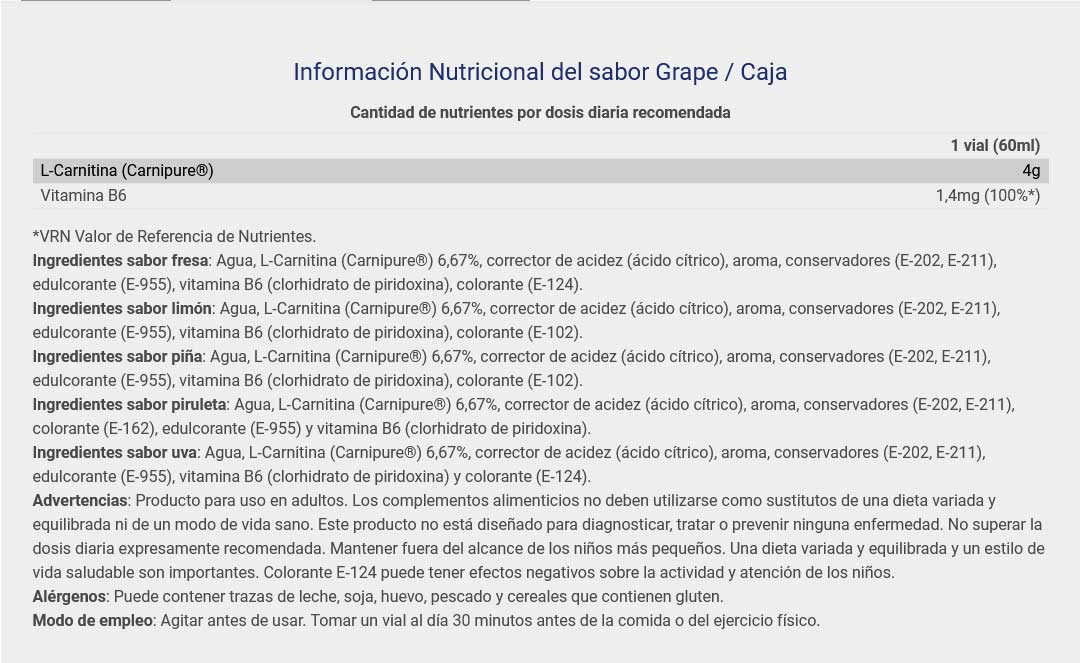 La carnitina es fundamental para el transporte de ácidos grasos de cadena larga a través de la membrana mitocondrial, como resultado de ello se descompone la grasa y la transforma en energía para tus entrenos, sin provocar nerviosismo o insomnio.
