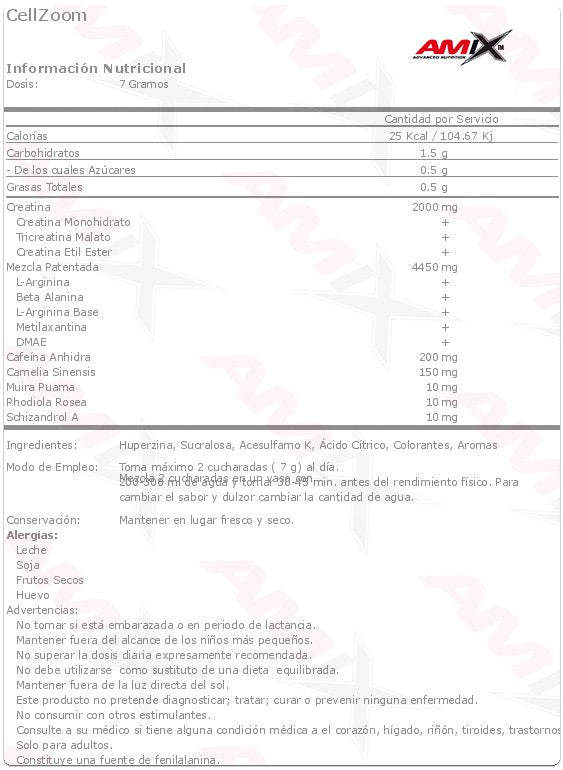 CellZoom está formulado con 3 tipos diferentes de creatina, óxido nítrico, arginina, cafeína, beta-Alanina, DMAE, entre otros muchos componentes.