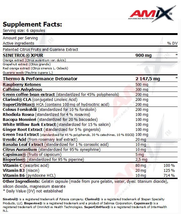 Detonatrolde AMIX MuscleCore es un quemagrasa de gran acción basado en materias de primera calidad. Detonatrol es el resultado de una investigación en los laboratorios Large Life para lograr un quema grasa realmente efectivo. Detonatrol combina diferentes materias primas como Sinetrol®, Clarinol®, Super CitriMax®, CapsiMax® y BioPerine®, además contiene otros 12 ingredientes que maximizan su efectividad.