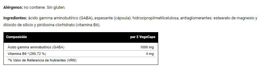 - Cada cápsula contiene 500 mg de GABA y 2 mg vitamina B6 (Quali®-B) (DSM®).
