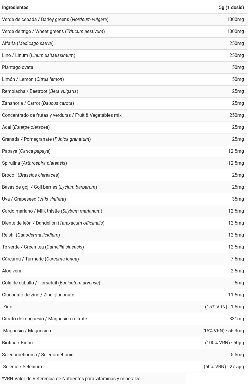 GREENS de BIG® es una combinación de más de 50 extractos vegetales y minerales enfocada a la desintoxicación y normalización de nuestro sistema digestivo. Los elementos vegetales presentes en la formulación contienen fruta variada, verduras, extractos de hierbas, algas y verdes de cereales como el trigo, la cebada o la alfalfa.