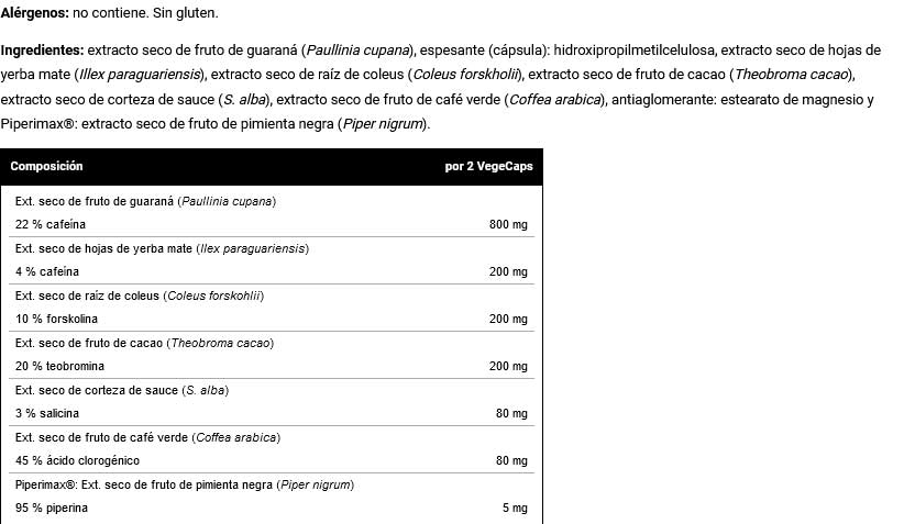 Guarana extracto seco, Yerba mate extracto seco, Coleus Forskohlii, Cacao, Café verde extracto seco, Sauce blanco extracto seco, Bioperine - extracto de pimienta negra. Otros ingredientes: Estabilizante (celulosa microcristalina), antiaglomerante (estearato de magnesio), cápsula: gelatina.