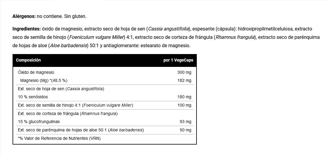 - Mecanismo de acción: el magnesio se absorbe poco y con lentitud, actuando como laxante osmótico salino. Atrae agua hacia la luz intestinal proporcionando la formación de masa de heces blandas. Estimula la secreción de colecistoquinina (hormona secretada por la mucosa intestinal) estimulando la motilidad intestinal y la secreción de líquido.